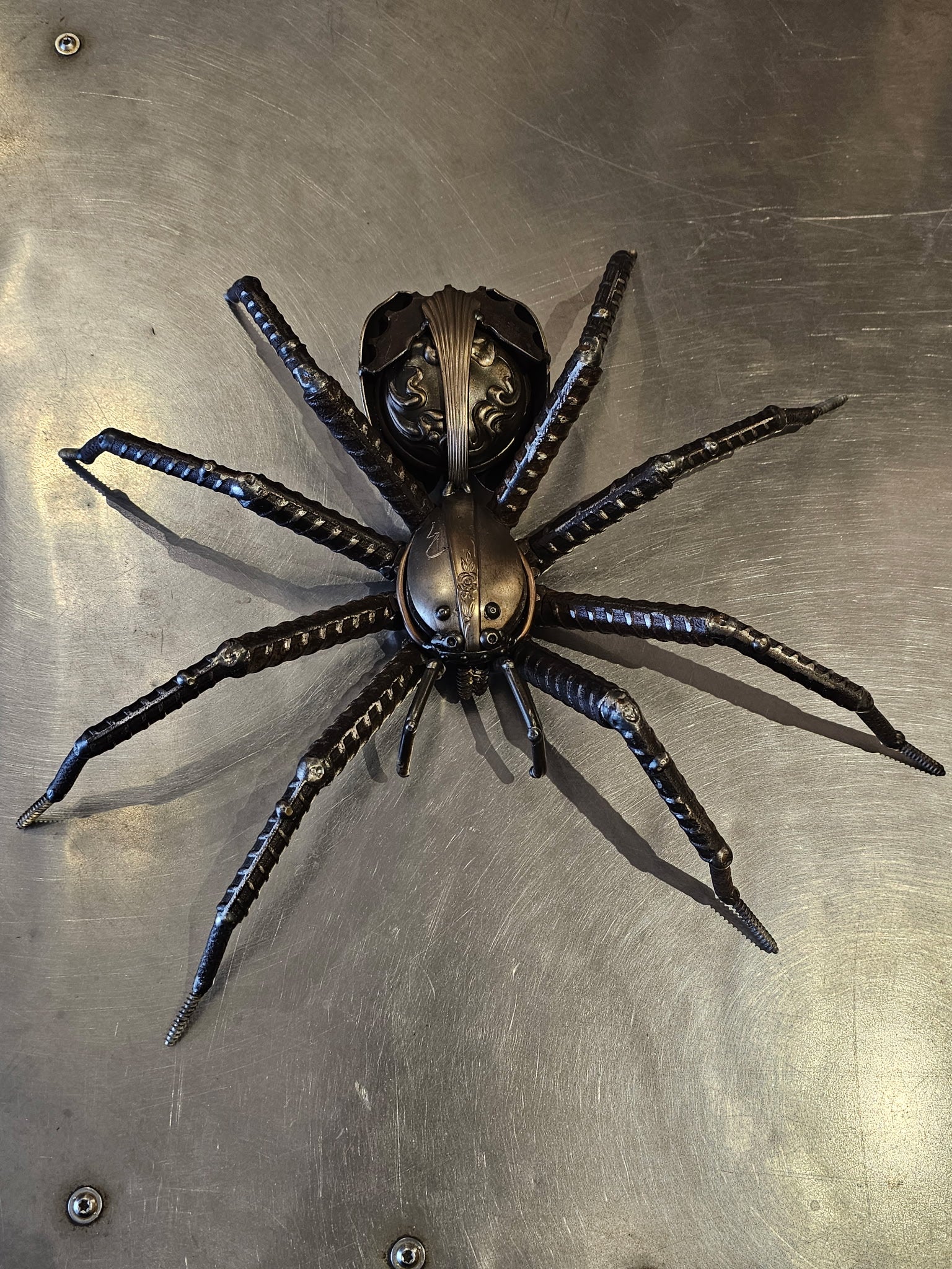 “Wolf Spider” by David Groenjes brings the intensity and precision of nature to life through reclaimed metal. Crafted entirely from welded and repurposed steel, this striking sculpture captures the raw power and intricate form of one of the desert’s most fascinating predators.
