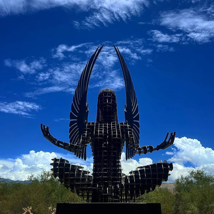 Note: This photo represents the style of the piece but may not show the exact sculpture available. Each work is one-of-a-kind — handcrafted from a unique mix of reclaimed materials such as auto parts, ammonites, and crystals — so variations in detail and composition make every piece original.