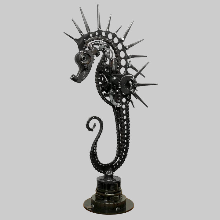 Note: This photo represents the style of the piece but may not show the exact sculpture available. Each work is one-of-a-kind — handcrafted from a unique mix of reclaimed materials such as auto parts, ammonites, and crystals — so variations in detail and composition make every piece original.