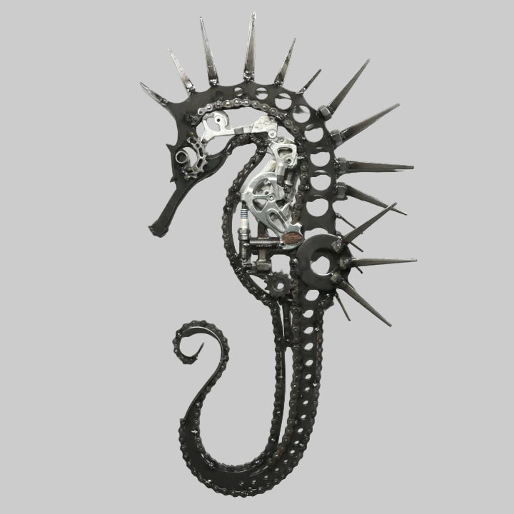 Note: This photo represents the style of the piece but may not show the exact sculpture available. Each work is one-of-a-kind — handcrafted from a unique mix of reclaimed materials such as auto parts, ammonites, and crystals — so variations in detail and composition make every piece original.