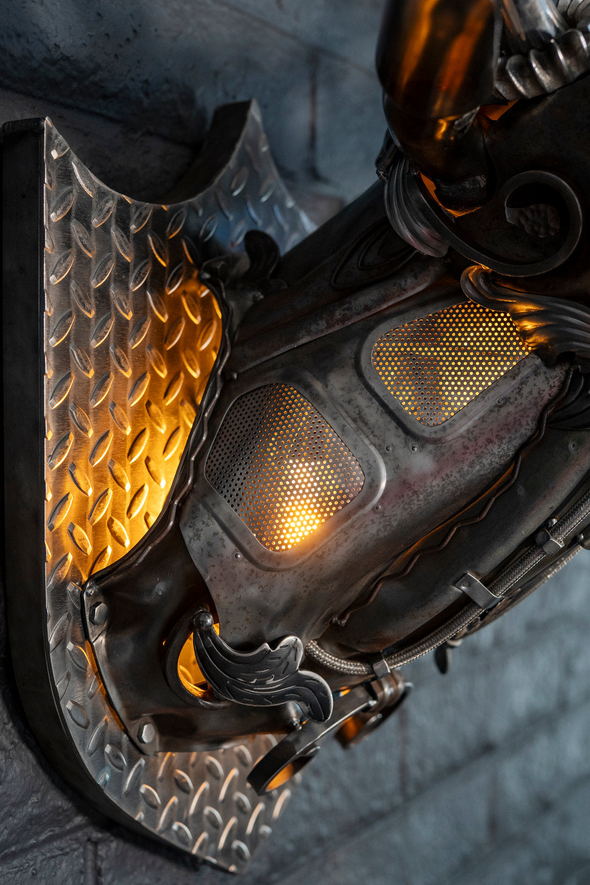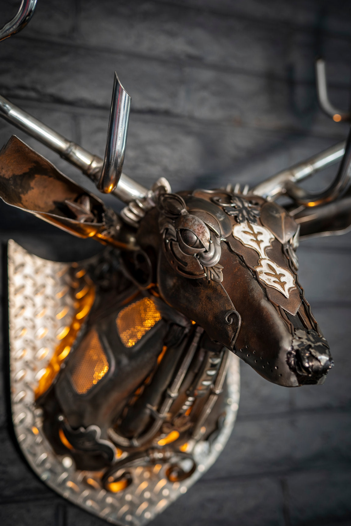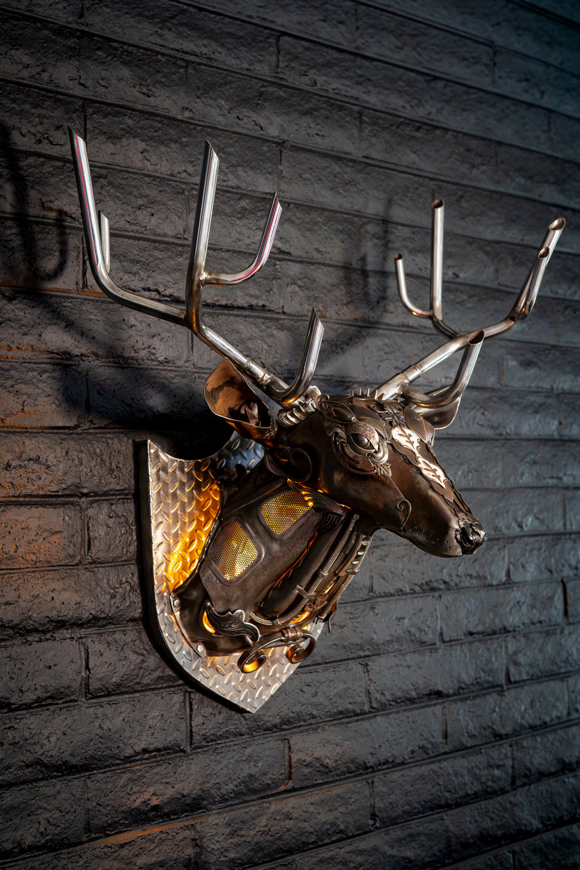 Warm internal lighting glows through vented metal panels, giving the stag a dramatic illuminated presence—perfect for creating ambiance in an entryway, lodge, office, bar, or statement wall. Every component is hand-shaped, welded, and assembled, showcasing Paul Klaine’s signature craftsmanship and his ability to transform raw metal into sculptural life.
