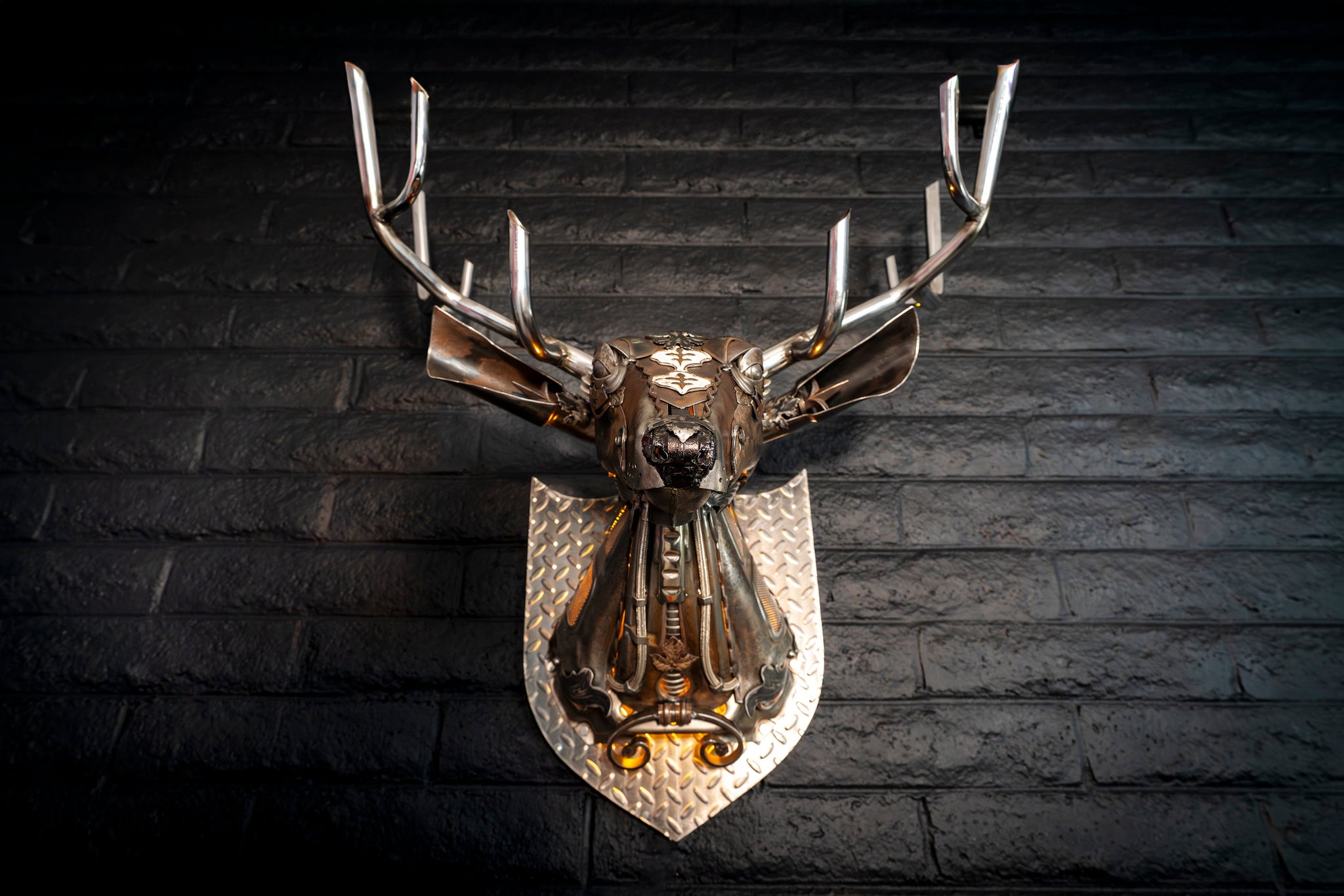 Command attention with "Buck Wild," a spectacular one-of-a-kind steampunk metal deer sculpture by acclaimed artist Paul Klaine. This mounted wall sculpture blends reclaimed steel, polished antlers, industrial plating, and intricate mechanical detailing to create a bold fusion of wildlife form and steampunk engineering.