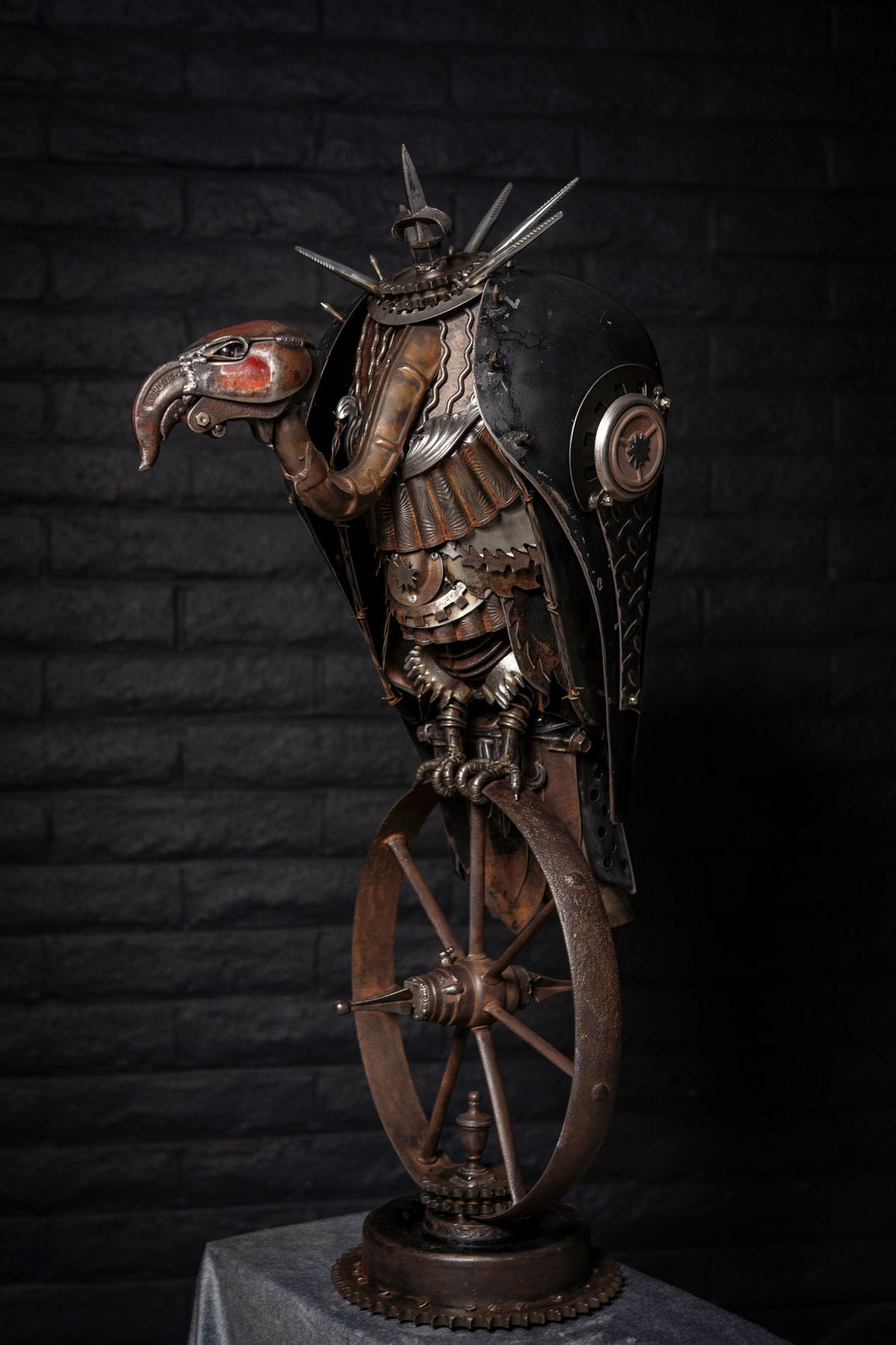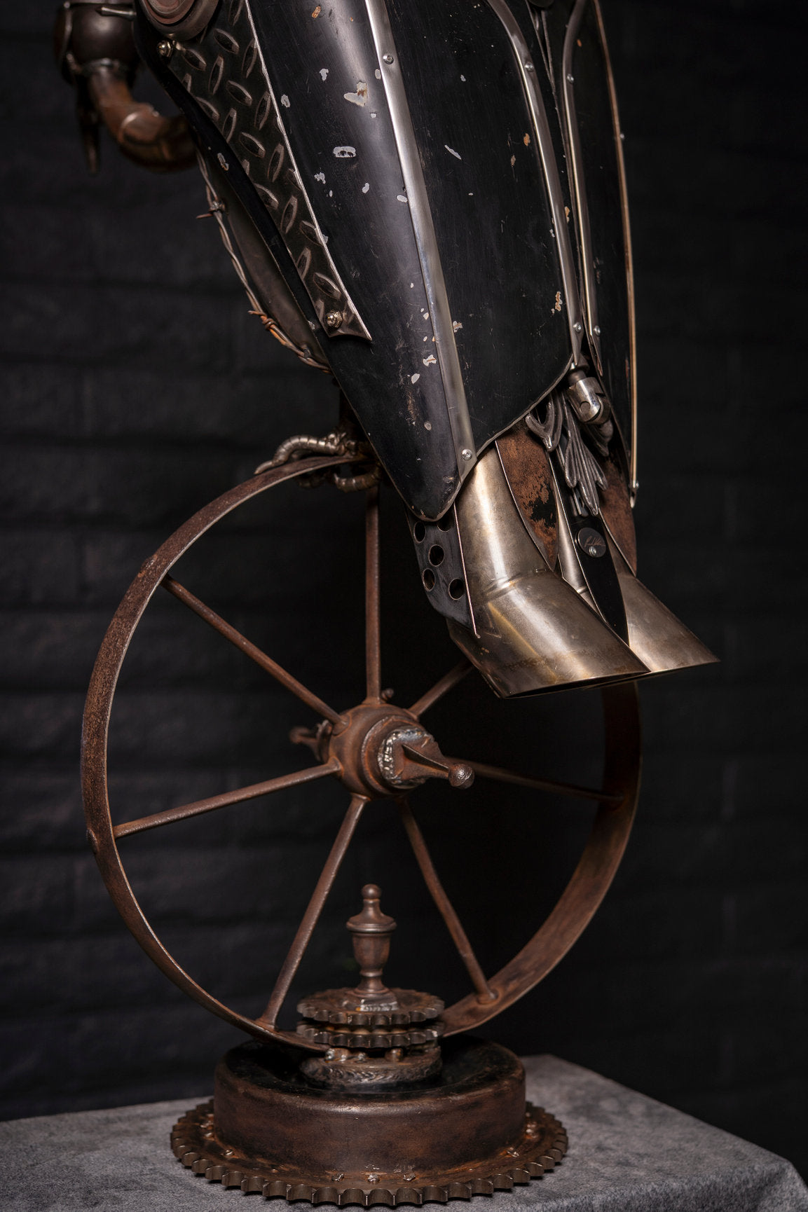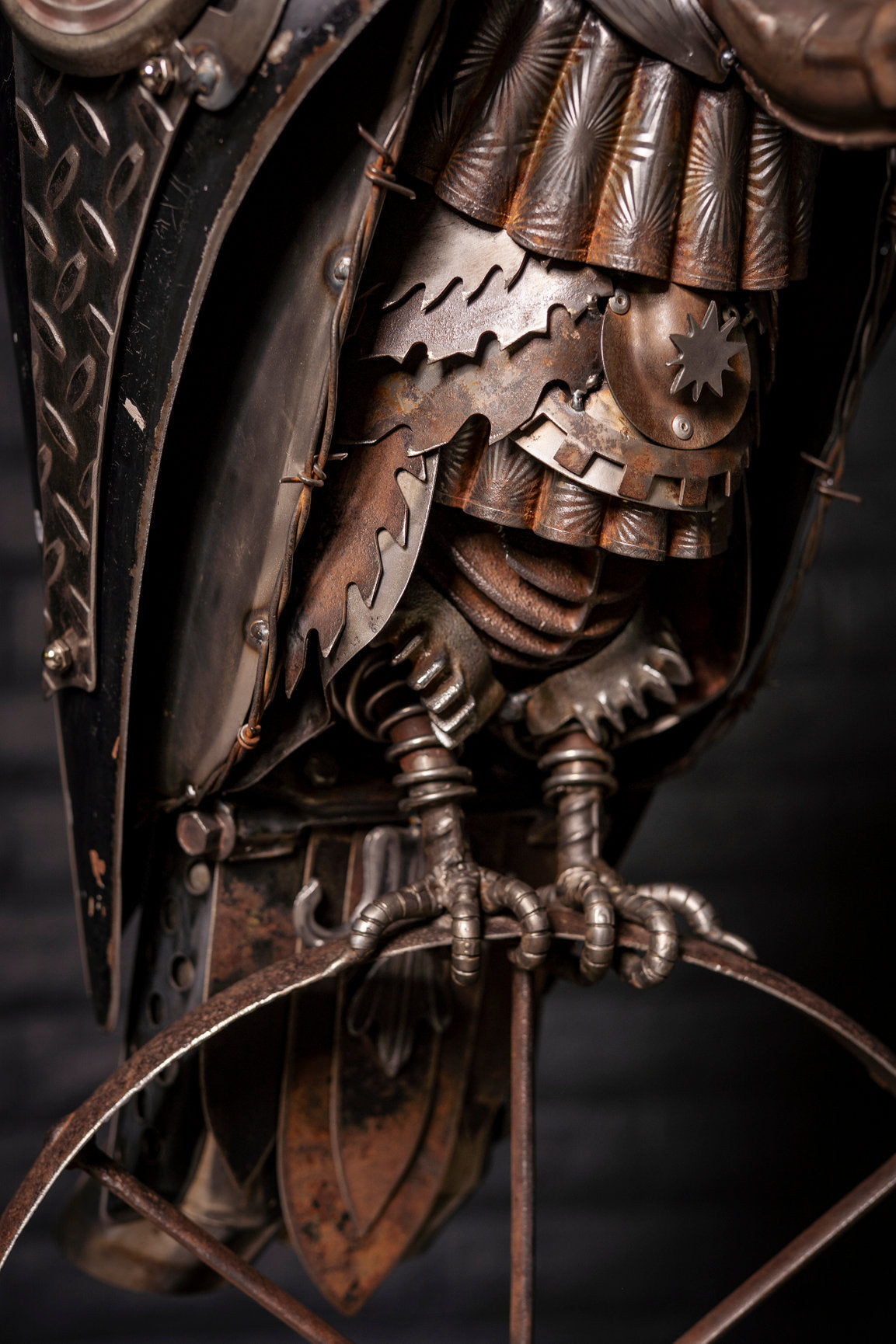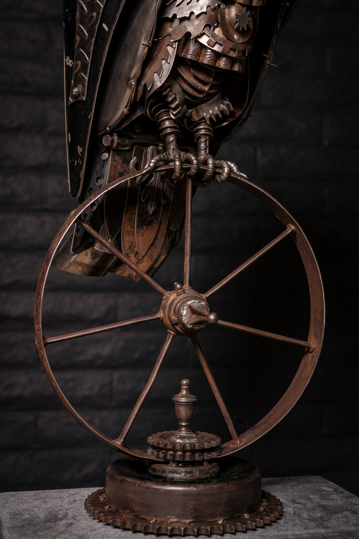 The sculpture balances organic avian form with mechanical ingenuity, as if this haunting figure is forever rolling forward into the horizon. A true statement piece, Lurking Westward embodies the themes of survival, dominance, and the relentless march of time—an unforgettable addition for collectors of bold, industrial-inspired contemporary art.