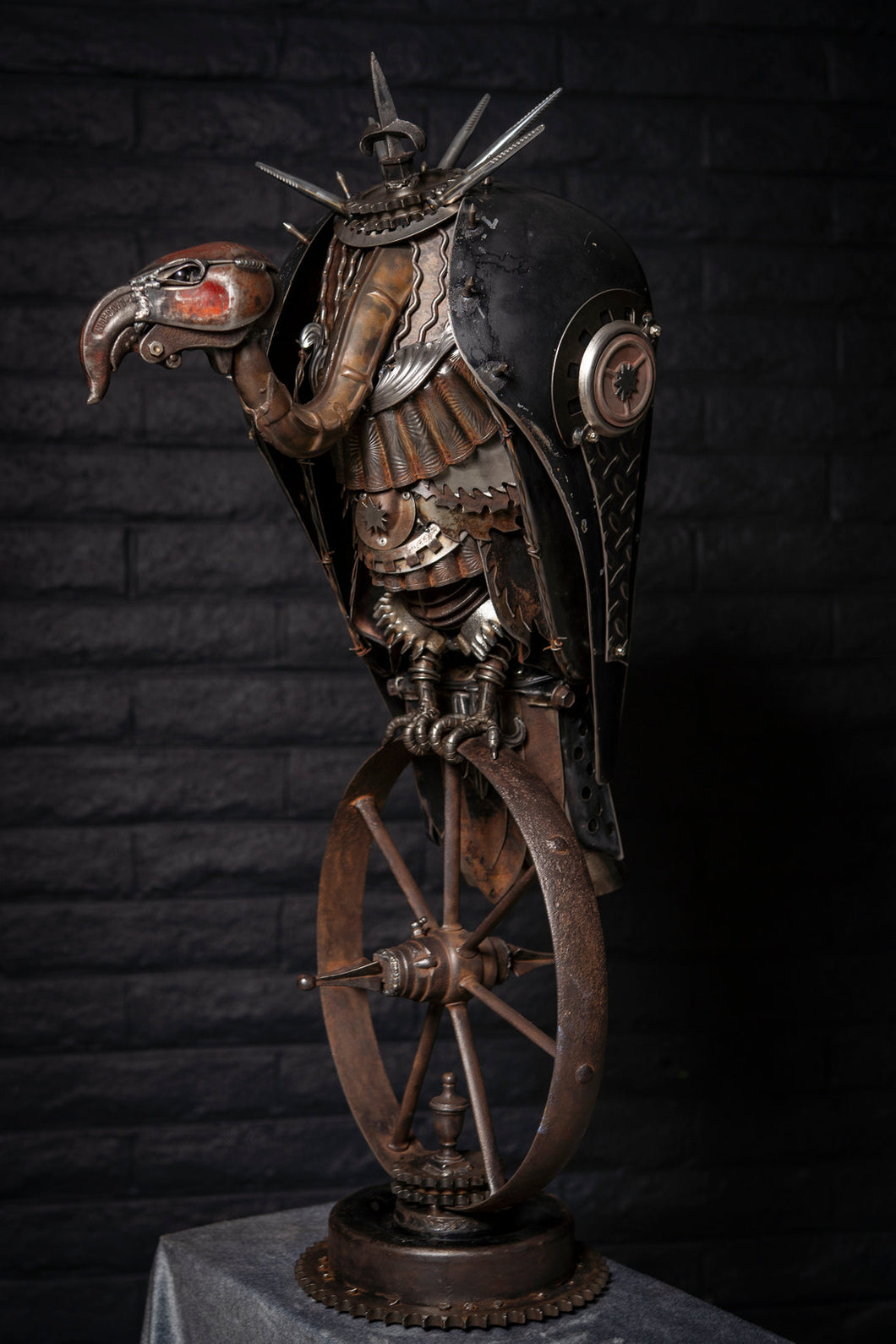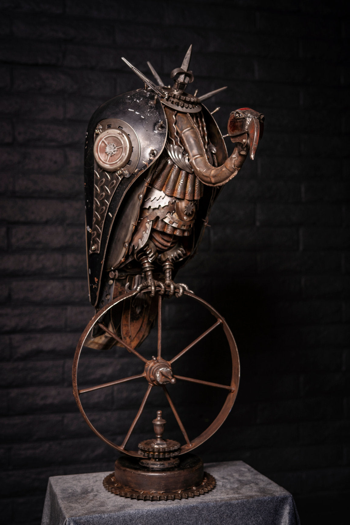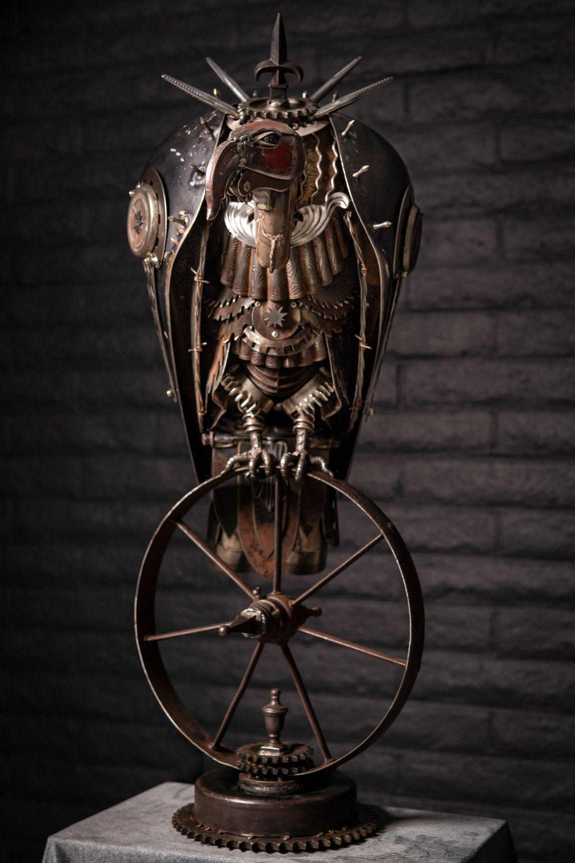 The sculpture balances organic avian form with mechanical ingenuity, as if this haunting figure is forever rolling forward into the horizon. A true statement piece, Lurking Westward embodies the themes of survival, dominance, and the relentless march of time—an unforgettable addition for collectors of bold, industrial-inspired contemporary art.