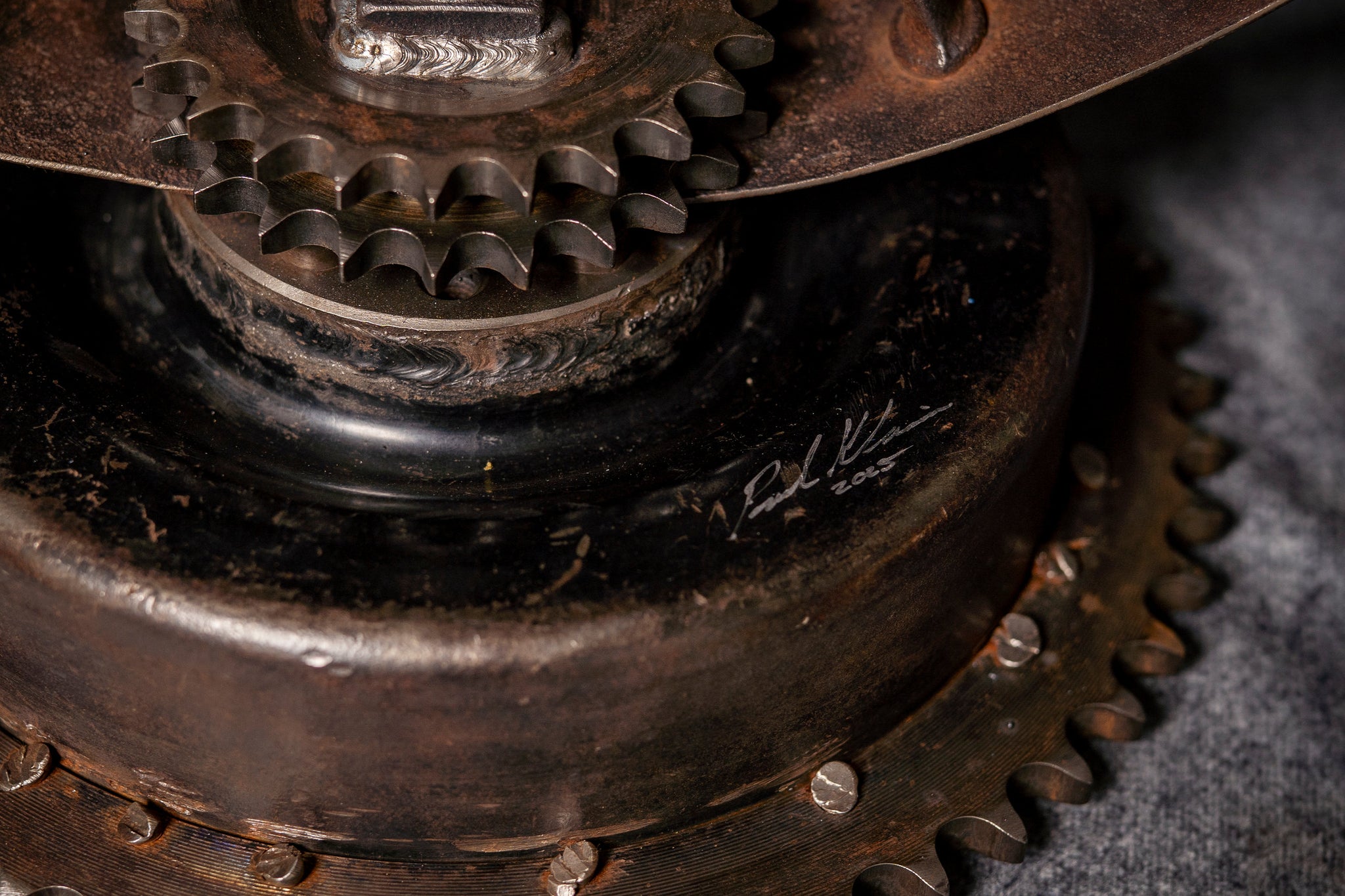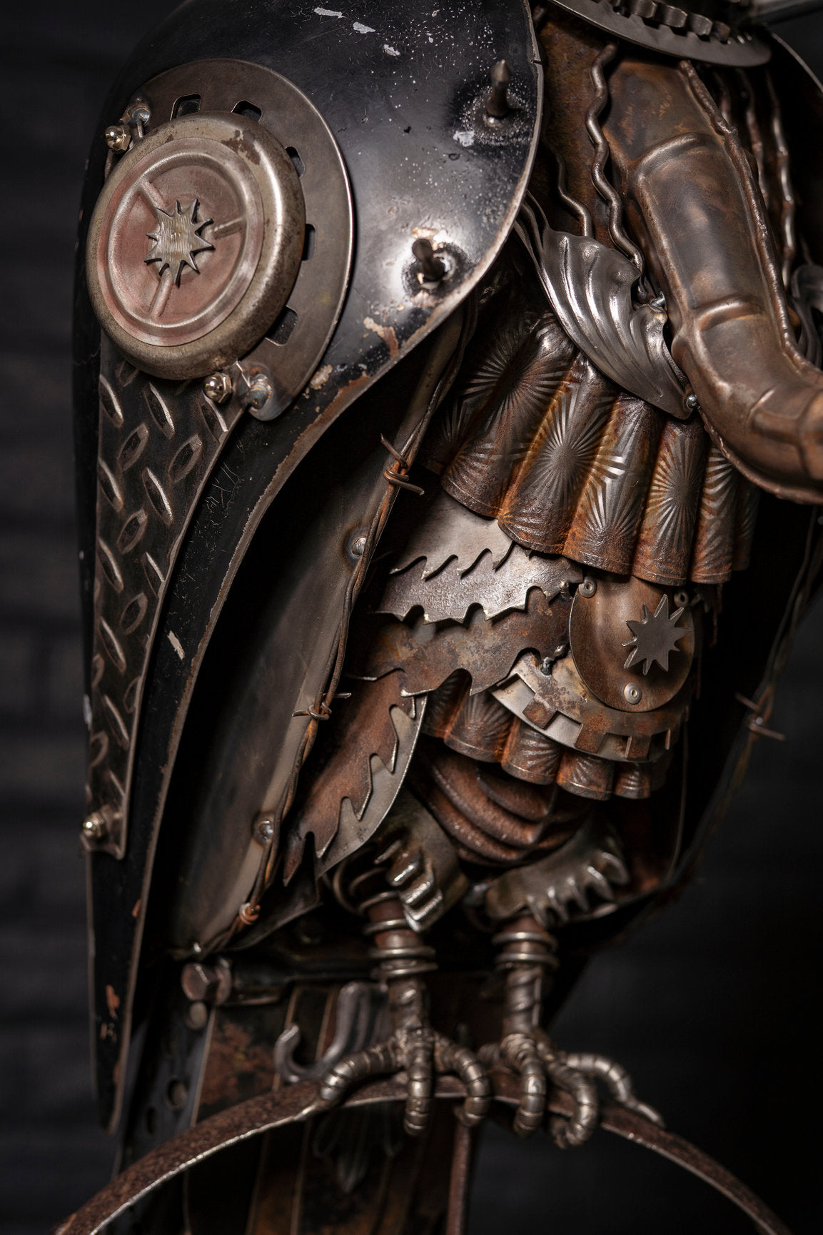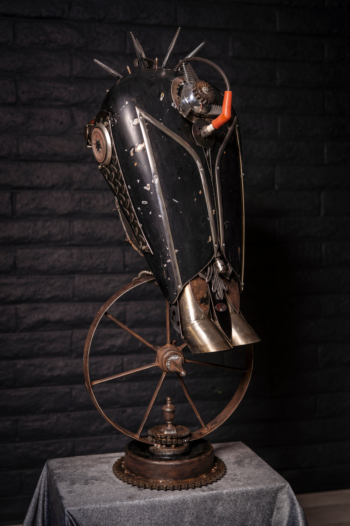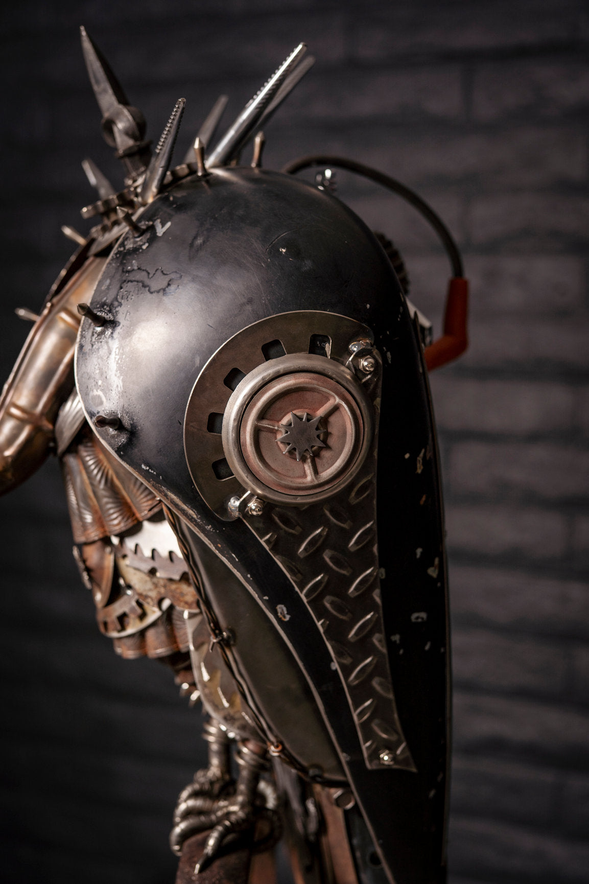 The sculpture balances organic avian form with mechanical ingenuity, as if this haunting figure is forever rolling forward into the horizon. A true statement piece, Lurking Westward embodies the themes of survival, dominance, and the relentless march of time—an unforgettable addition for collectors of bold, industrial-inspired contemporary art.