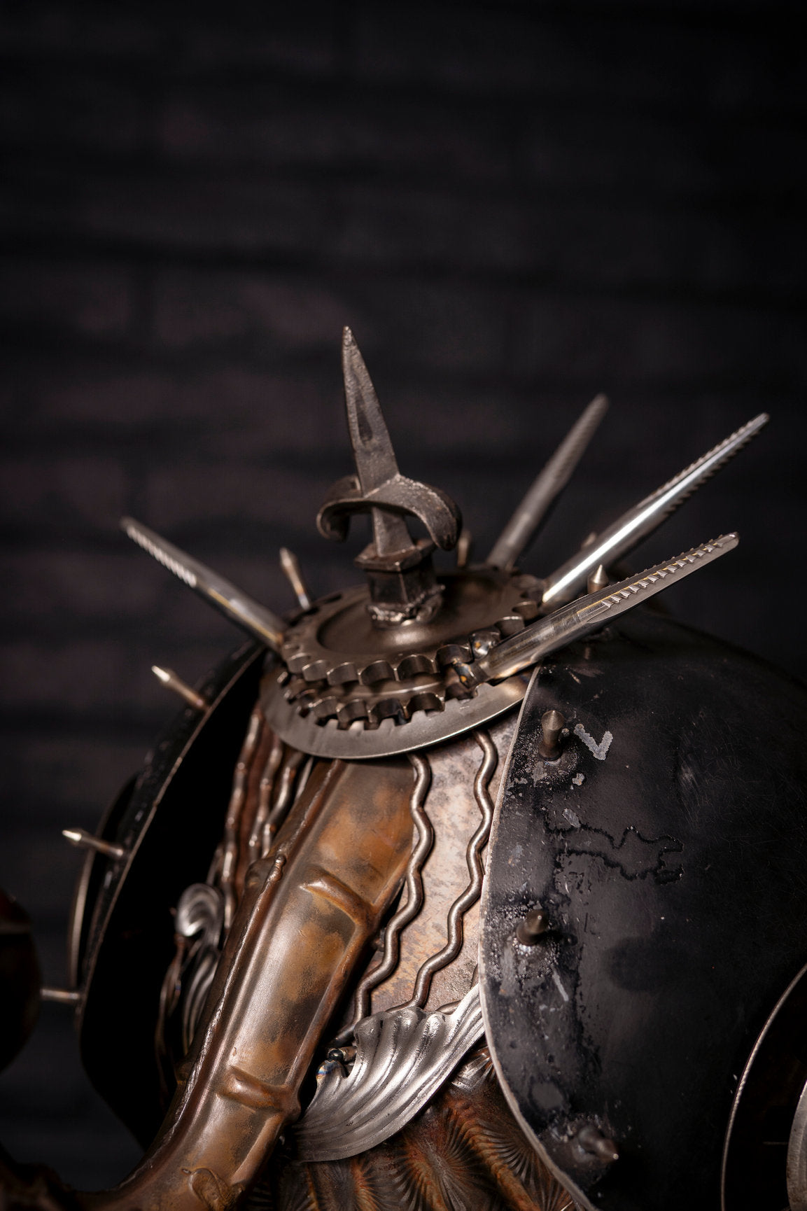 With an ominous stance and mechanical precision, Lurking Westward captures Paul Klaine’s signature ability to fuse industrial grit with imaginative storytelling. This striking reclaimed metal sculpture depicts a vulture-like creature armored in steel, perched atop a single spoked wheel. Its sharp beak, fierce gaze, and spiked crown evoke both menace and majesty, while layers of gears, plates, and welded textures highlight Klaine’s mastery of detail.